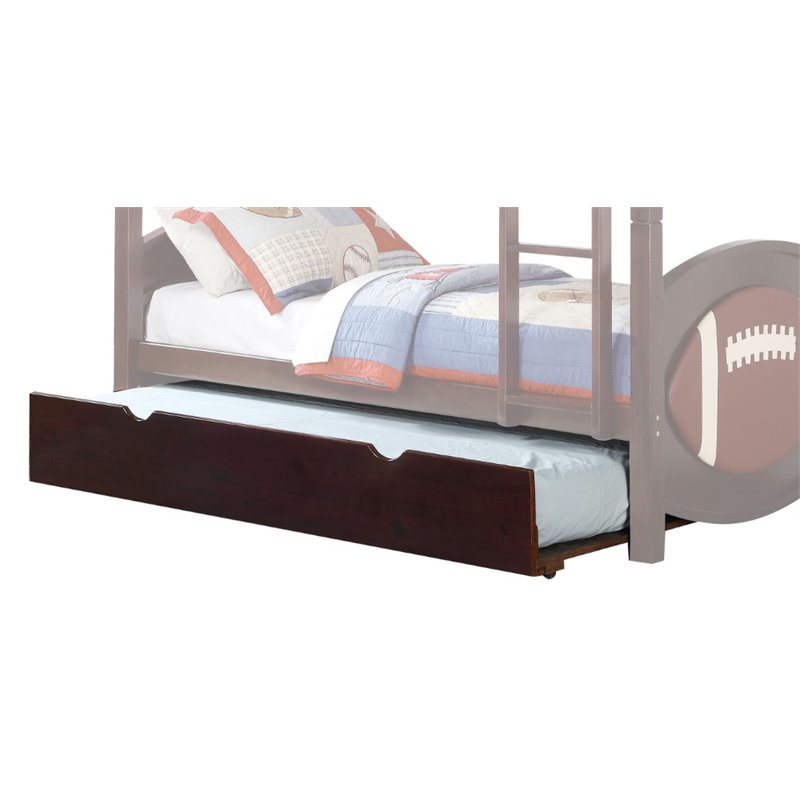| ACME Furniture - Trundles - 11959 - The All Star Collection is a perfect solution for any little athlete's bedroom! Made of hardwood solids and veneers and finished in rich espresso. The twin bunk bed offers durability, the guard rails provide safety and the ladder allows for easy access to the top bunk. Available optional under bed trundle or two piece drawers. The trundle is the perfect space saving solution or an option for an extra mattress, while the drawers can help stay more organized. The sport theme design of this collection combines both enjoyable and convenient. Finish: EspressoMaterials: Pine wood & PlyContemporarySpecifications:Overall Product Dimensions: 11 H x 75 W x 41 DProduct Weight: 42 lbsWeight Capacity: 165 lbs Top, 200 lbs Bottom (Top Bed & Not be used for children under 6 years of age.)