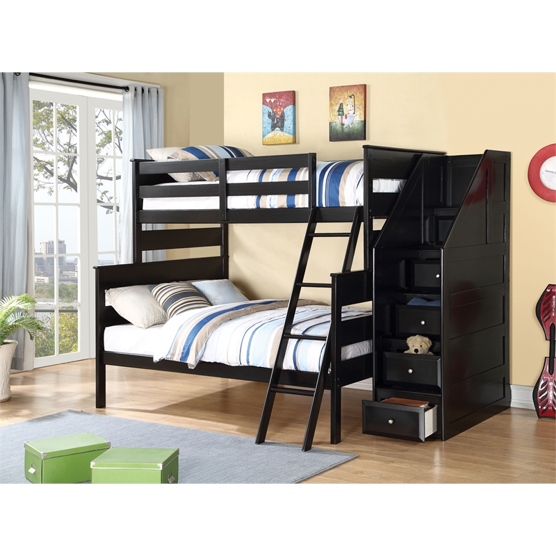 | ACME Furniture - Bunk Beds - 37365 - Designed to save space, the Alvis twin over full bunk bed with storage ladder is a perfect solution for your children’s bedroom. This rich black piece features easy access guard rail for safety and staircase drawers for additional storage and convenience. This will be the best option for your kid’s room. Finish: BlackMaterials: Pine Wood, MDF, PlyContemporaryFull Length GuardrailSlat System IncludedSpecifications:Overall Product Dimensions: 68 H x 81 W x 58 DProduct Weight: 272 lbsStorage Ladder Dimensions: 68 H x 42 W x 19 DWeight Capacity: 165 lbs Top, 200 lbs Bottom (Top Bed & Not be used for children under 6 years of age.)