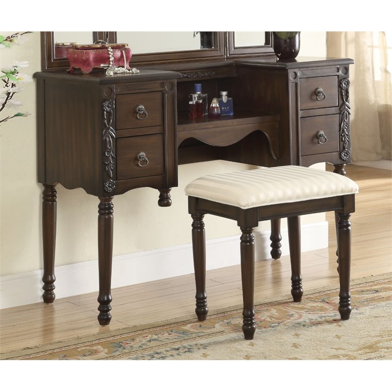 | ACME Furniture - Bedroom Vanities - 06540 - The Ashton vanity collection is crafted in a warm oak finish veneer. The vanity desk features a center shelf and four drawers, which is great for storing your small items. Add the mirror to the set for extra eye appeal, featuring beautiful floral artwork on the frame. Enjoy getting ready for your day in style. Finish: Oak; Materials: Rubber Wood, MDF; Contemporary; Felt lined Drawer. Specifications:Vanity Dimensions: 35 H x 46 W x 19 D; Stool Dimensions: 20 H x 20 W x 14 D; Product Weight: 90 lbs; Seat Height: 20.