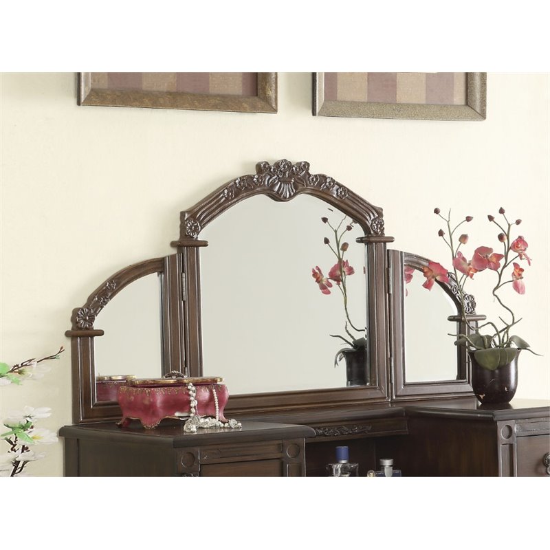 | ACME Furniture - Mirrors - 06541 - The Ashton vanity collection is crafted in a warm oak finish veneer. The vanity desk features a center shelf and four drawers, which is great for storing your small items. Add the mirror to the set for extra eye appeal, featuring beautiful floral artwork on the frame. Enjoy getting ready for your day in style. Finish: OakMaterials: Mirror, Rubber WoodContemporaryTri-fold Vanity MirrorSpecifications:Overall Product Dimensions: 24 H x 44 W x 1 DProduct Weight: 18 lbs
