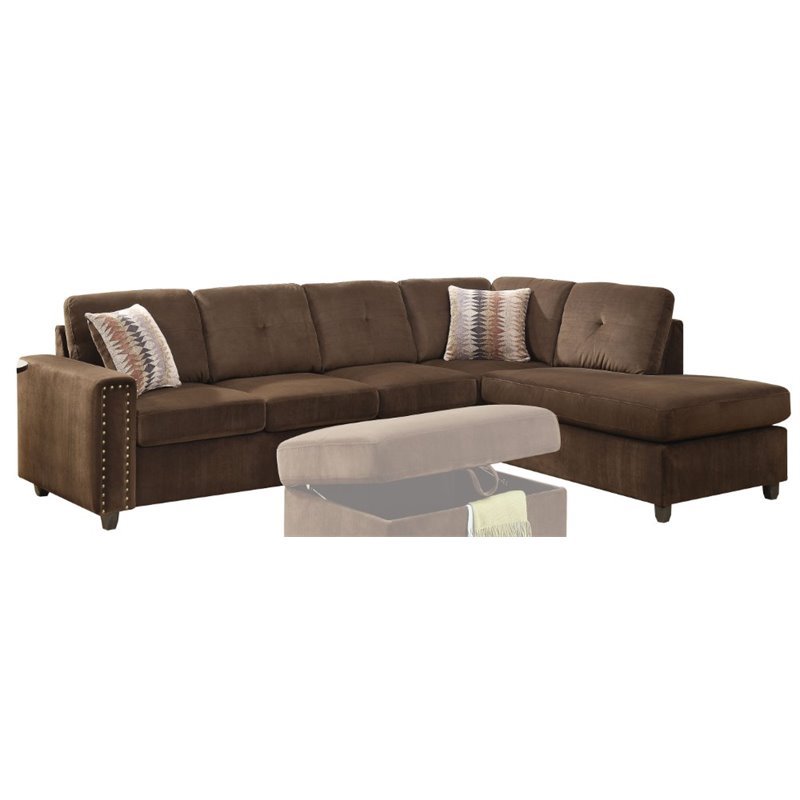 | ACME Furniture - Sectionals - 52700 - The Belville Sectional Sofa features reversible chaise, two accent pillows, removable seat cushion, loose backrest pillows, and matching storage ottoman. It's sleek and casual design will give your living room the perfect contemporary look. This collection is available in chocolate, beige, and gray velvet for you to choose from. Finish: ChocolateMaterials: Velvet, Wood Frame, Foam, Pocket CoilContemporaryPillow IncludedSpecifications:Overall Product Dimensions: 36 H x 79 W x 33 DSofa Dimensions: 36 H x 78 W x 33 DChaise Dimensions: 36 H x 79 W x 33 DProduct Weight: 177 lbsSeat Depth: 21Seat Height: 20