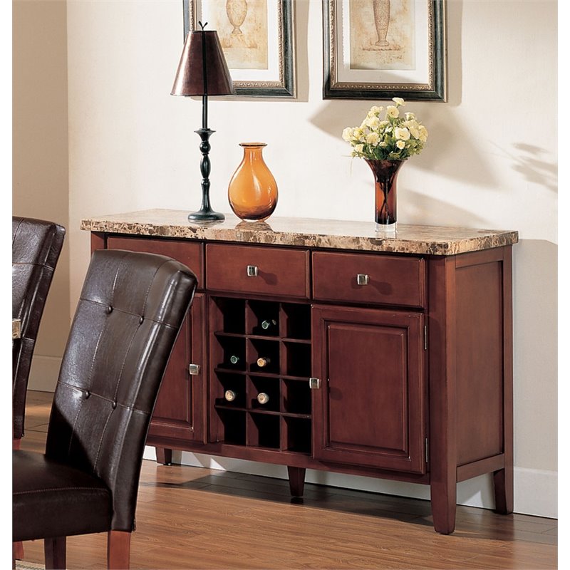 | ACME Furniture - Buffet Tables & Sideboards - 07047 - The Bologna transitional collection will blend masterfully in your dining room. The server reflects selected marble stone top and wooden storage base. Finish: Brown and CherryMaterial: China Marble, Wood (Solid), Wood Veneer, MDF, PB3 drawers & 2 DoorsWine Bottle Storage RackMarble Top (Real Marble)drawers Glide: Center Wood (Ext 1/2), DT Not Included, Felt Lined All DrawersSpecifications:Overall Product Dimensions: 34 H x 56 W x 18 DProduct Weight: 132 lbs