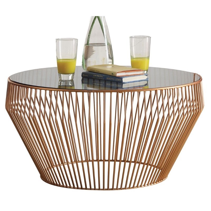 | ACME Furniture - Coffee Tables - 81435 - This Camry modern coffee table brings a unique yet classy look to your living room. With effortless infusion of smoky glass and unique retro inspired copper metal base, this piece will naturally blend in your living room, making it a statement of any room decor. Finish: Copper, SmokyMaterials: Glass, Metal TubeContemporarySpecifications:Overall Product Dimensions: 15 H x 30 W x 30 DProduct Weight: 41 lbs