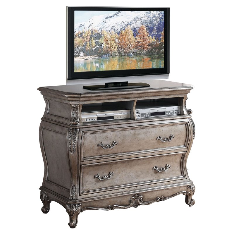 | ACME Furniture - TV Stands - 20547 - Designed exclusively for ACME, the Chantelle bedroom collection is filled with romantic wonder. The French rococo button tufted headboard and footboard complemented with a broad selection of granite top case pieces to create a perfect suite for any bedroom in the house. The versatile styling of the Chantelle bedroom allows this group to be a center piece to any décor. Finish: Antique PlatinumMaterial: MDF Top, Poplar Wood, Birch Veneer2 drawersGlide: Side Metal Full ExtensionQueen Anne Leg With Ornamental Leave DetailDovetail: French Front & English BackSpecifications:Overall Product Dimensions: 36 H x 45 W x 20 DProduct Weight: 119 lbs
