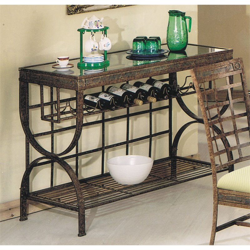 | ACME Furniture - Buffet Tables & Sideboards - 08632 - The collection Egyptian this intersection of sleek and chic. The dining set is perfect for gatherings. The dining table features an interesting curve and scroll designed bottom. The slight curved legs, and upholstered seat covered in beige microfiber. Finished in Matte pewter and bronze metal. Finish: Bronze PatinaMaterial: Iron and GlassSpecifications:Overall Product Dimensions: 34 H x 50 W x 20 DProduct Weight: 54 lbs5mm Clear Tempered Glass (NOT Beveled): .2 H x 48.3 W x 2.8 D