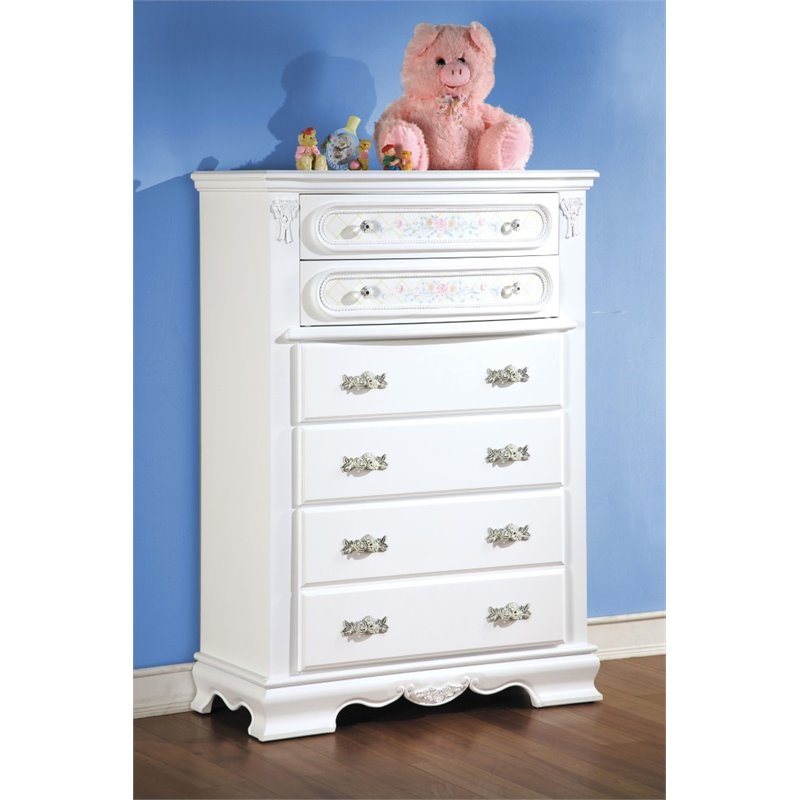 | ACME Furniture - Chests - 01666 - The Flora bedroom features beautiful floral motif decals, oval rope molding and decorative profiled crown molding on all cases. This beautiful girl bedroom is perfect for your favorite princess. Finish: WhiteMaterial: MDF top and side panel, MDF Edge, Poplar Wood (Solid)Center Wooden Glide, DT: French Front, Felt Lined Top DrawerSpecifications:Overall Product Dimensions: 52 H x 36 W x 18 DProduct Weight: 126 lbs