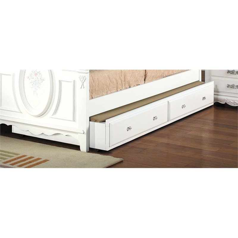 | ACME Furniture - Trundles - 01683TRN - The Flora bedroom features beautiful floral motif decals, oval rope molding and decorative profiled crown molding on all cases. This beautiful girl bedroom is perfect for your favorite princess. Finish: WhiteMaterial: Poplar Wood (Solid)Specifications:Overall Product Dimensions: 12.25 H x 75.25 W x 40.88 DProduct Weight: 68 lbs