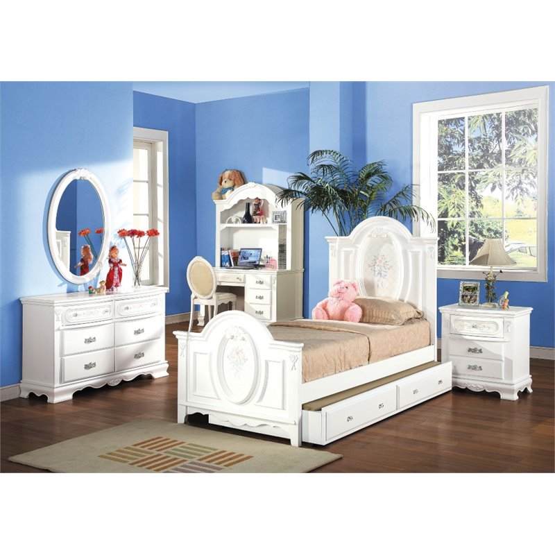 | ACME Furniture - Beds - 01680T - The Flora bedroom features beautiful floral motif decals, oval rope molding and decorative profiled crown molding on all cases. This beautiful girl bedroom is perfect for your favorite princess. Finish: WhiteWith 3 Slats - Box Spring RequiredSpecifications:Overall Product Dimensions: 57 H x 76 W x 43 DProduct Weight: 92 lbs