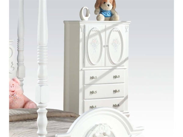 Accentuated by a cross hatch design behind the floral bouquet and a pretty apron on the bottom of the case the Flora White 3 Drawer and 2 Door TV Armoire - Acme Furniture is a beautiful bedroom piece fit for a princess. It features ample storage room for clothing. Three drawers keep clothing and accessories neat and tidy and the space behind two doors is perfect for bulky clothing or toys. Features