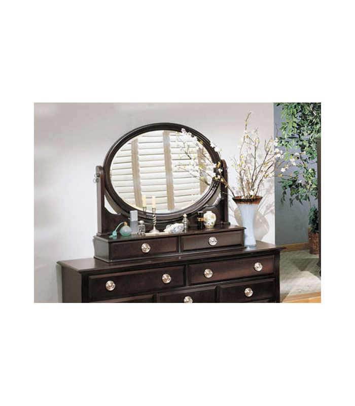 Durable and built to last the Amherst Rotating Mirror in Espresso - Acme Furniture is an elegant addition to your bedroom. Oval mirror with two additional drawers is ideal for jewelry or smaller items. Polished bail pulls add elegance and style. Features