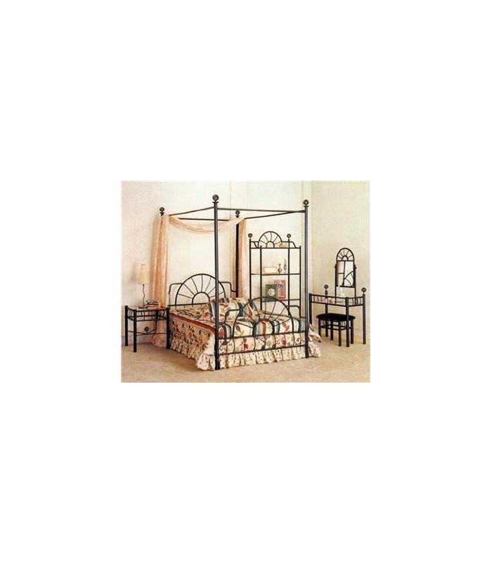 Combining the durability of metal with urban inspiring design this Black Metal Queen Canopy Bed Headboard and Footboard exudes glamour and sophistication. The radial headboard and footboard as well as the tall canopy frame speak of versatility and innovation. The headboard and footboard of the metal canopy bed feature a lovely sunburst motif with spherical finials sit at the top for the perfect finishing touch. This canopy headboard and footboard is available in full and queen sizes to fit your space and meet your needs. The glass top nightstand is impressively designed and the opulent black finish is sure to charm your decor with style and aplomb. Complemented by the spherical finials at the tops the case goods also reflect the lovely sunburst motif with the functional practicality. The black metal finish is urban keeping the Black Metal Collection in balance. This stunning Bedroom Collection will make a bold centerpiece in your casual bedroom! Features