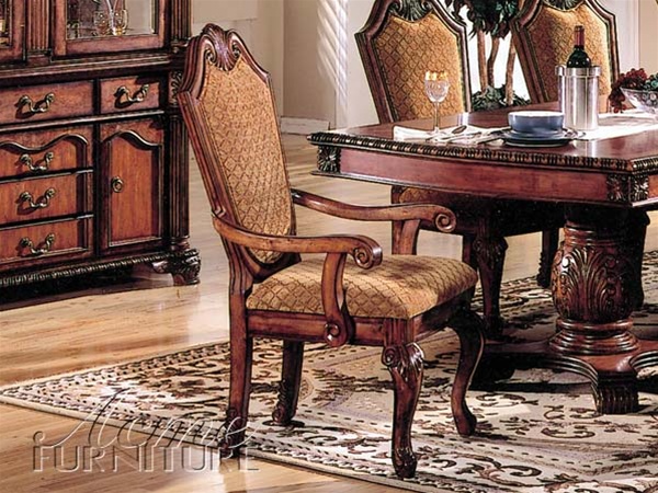 Warm and charming Chateau De Ville Tan Arm Chair will bring joy and elegant look to any traditional dining setting. Designed with a great craftmanship and upholstered back and seat for maximum comfort. The arm chairs feature padded and upholstered in a two toned wood stained with warm diamond patterned fabric upholstery seats and backs. Each piece is finely crafted from solid wood wood veneers and elegant tan fabric upholstery that highlights fine carvings with a rich antique look and feel. Enjoy the exquisiteness and maximum comfort with these arm chairs that will bring more joy to your parties. Features
