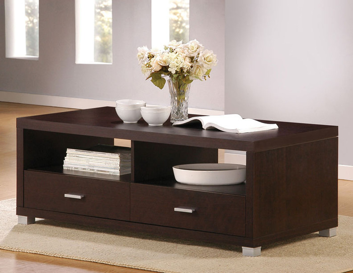 Two open cabinet racks on the top half and drawers on the bottom half make the Tustin Espresso Coffee Table very useful and smart addition. The Tustin Collection is also accentuated with gorgeous nickel legs and handles. Features
