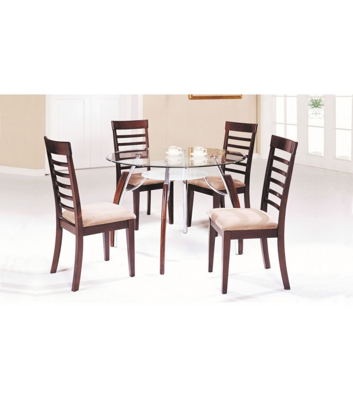 Practical and stylish Martini Round Glass Top Dining Table will add a sophisticated touch to your contemporary home. The table's sleek glass surface is ideal for maximizing space. The table has sturdy metal curved legs with wooden accents in cherry finish. The elegant undershelf with frosted glass top provides a perfect solution for storage. Whether it's breakfast a casual dinner or your favorite show you'll enjoy in style with a gorgeous rich finish silver metal trim and glass tabletop. The table is sure to brighten any contemporary space. Pair with matching beige upholstered chairs from Martini collection to create the perfect look for your home. Features