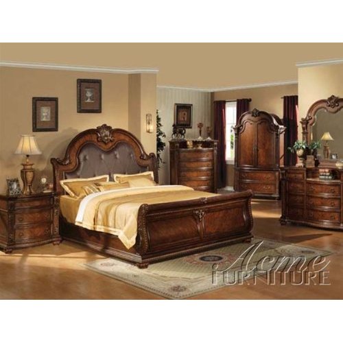 Constructed with great detailed carvings and finished in a fabulous cherry Anondale Sleigh Bed in Cherry - Acme Furniture is sure to be a delightful addition to your bedroom. Sleigh bed has button tufted brown leather upholstery headboard with decorative stitch. Beautiful crown on the headboard is also present on the mirror and TV Armoire. Mattress and bedding sold separately. Features