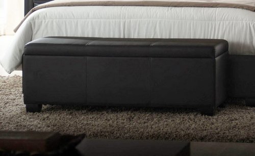 This Ireland Black Bi-Cast Vinyl Upholstered Storage Bench offers a warm comfortable atmosphere and will look beautiful placed next to the footboard of your bed. The softly cushioned top is upholstered in a dark by-cast like vinyl allowing for a comfortable place to sit. The top opens allowing storage of your blanket and linen. Features