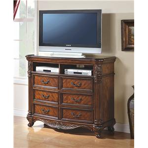 Modern commodity meets classic beauty in this TV console design from the Remington collection. Six drawers perfectly accommodate DVDs CDs and electronic accessories while a divided shelf houses media players. Delicately carved whorl feet are sturdy and durable giving this piece a stability you'll appreciate for your television. Antiqued pull hardware and ornate traditional carvings add that hint of royal glamour while a deep brown cherry finish keeps the piece perfectly elegance and classically stylish. Features
