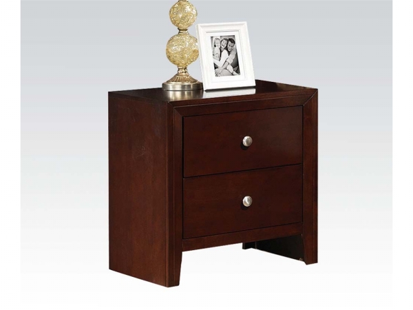 Sleek and contemporary this nightstand offers simple bedside storage with modern sophistication. Store your nighttime reading in the two drawers and enjoy having everything you need right at your fingertips. Grounded on tapered feet and finished in a brown cherry color this simple nightstand invites warm tones and convenience into your bedroom. Features
