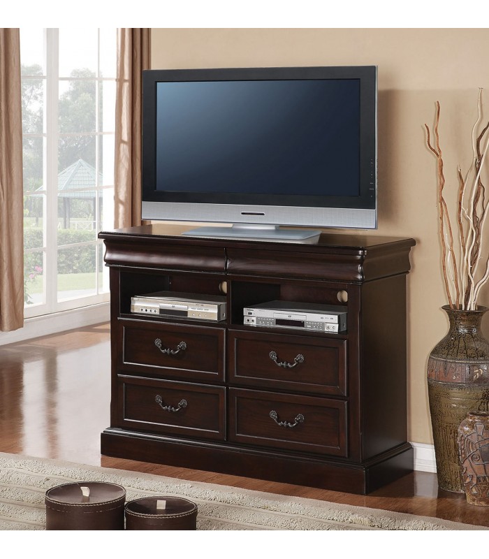 The Acme Roman Empire II collectiont TV Console in dark cherry finisha traditional typereflects grand style by hand selected dark cherry veneers with oversized raised feet.4 Detailed hardware drawers below you can hold movies or extra clothesplus 2 open compartments ideal for electronic devices or CDS. Features