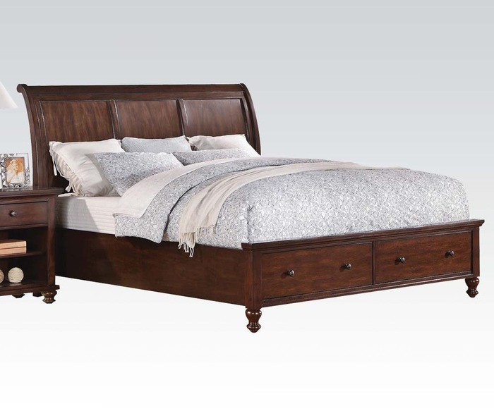 Handsome Transitional Design Fits Easily with Most DecorsWarm Cherry FinishQuality Burnished Metal Drawer PullsDurable Construction of Solid Wood and Wood Veneers with Storage Drawers in Footboard and Gentle Sleigh Style Headboard. Features