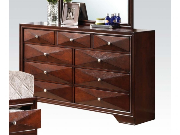 Spacious drawers provide ample space for all your clothing bedding and linen. Dramatic beveling on each drawer adds a sculptural look to the dresser's front. For enhanced style the drawers are accented with silver finish knob hardware. Contemporary Windsor Contemporary Dresser in Merlot brings a modern silhouette. Features