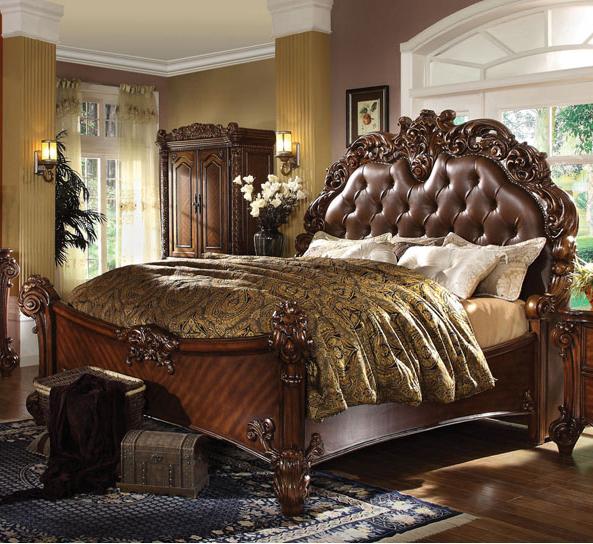 Create an elegant and traditional style look in your master bedroom with this panel bed. The ornate headboard features wood carvings button tufted leather like upholstery and lots of traditional detail. Sitting on carved wood feet finished in Cherry with more carved details on the footboard and along the rails this panel bed is sure to create a sophisticated environment in your master bedroom. Features