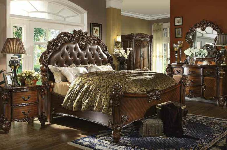 Create an elegant and traditional style look in your master bedroom with this panel bed. The ornate headboard features wood carvings button tufted leather like upholstery and lots of traditional detail. Sitting on carved wood feet finished in Cherry with more carved details on the footboard and along the rails this panel bed is sure to create a sophisticated environment in your master bedroom. Features