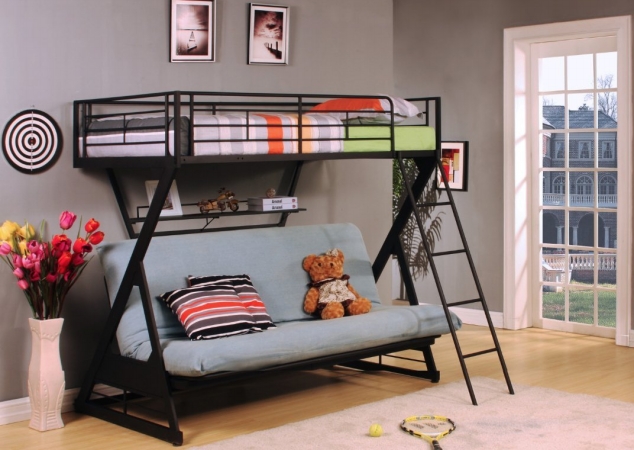 Fitting right in any youth bedroom the Acme's Zazie Z-Shape Twin/Futon Bunk Bed with Bookshelf will please everyone with its contemporary metal design and relaxing space matching any decor. The high-quality metal frame is durable and secure. The ladder and opening guardrail can be assembled at left or right side according to your needs. Some assembly required. Features