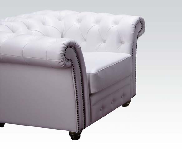 Camden upholstery arm chair in white finishreflects button tufted nail head styling bonded leather decorative double stitch roll arm restand turned carved feet.This arm chair will bring back that classic style to a living room environment. Features