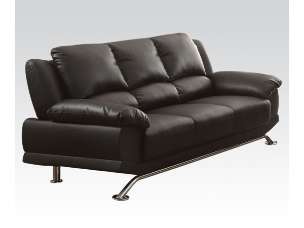 The Maigan collection offers a stylish and comfortable look featuring high chrome legs and durable bonded leather seating. This black sofa set is sure to make a statement in your living room.