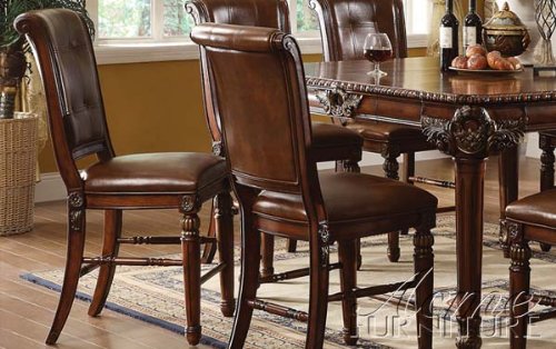 The graceful elegance of our Winfred collection makes every meal a celebration. Expertly crafted of solid hardwoods and resin with selected veneers then finished in a multi-step hand-rubbed rich cherry. Every piece is finely detailed with ornate carvings and the handsome counter height chairs are padded in leather-like fabric. Features