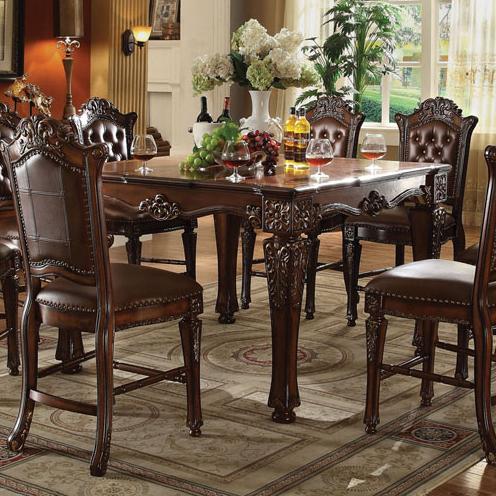 This counter height table is anything but casual with carved motifs along the table edge and down the legs. With room for eight counter height chairs around the outside this table can create a space to gather with friends or family while enjoying a meal a glass of wine or just each others company. Finished in a warm Cherry color to complete the look use this counter height traditional style table to update your dining room or eat-in kitchen area. Features
