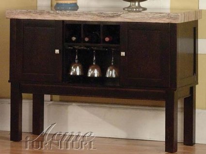 Beautiful stylish and elegant server. It is part of Fraser collection. This collection is made in the transitional style and will look good in any interior. It's crafted from solid hardwoods and veneers in espresso finish. Furniture features a big block legs in espresso. This server has faux marble top two doors wine rack and glass holder. Features