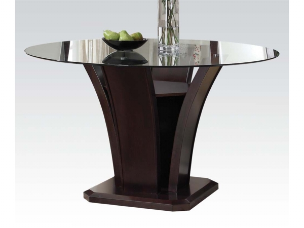 Gives your dining area the feeling of European dinner with Malik dining set in espresso finish with leather-like PU chairs back seat. For coffee with guests or brunch with the family. This collection serves up refreshing style at every occasion with its beveled edge glass top and organic flower petal inspired base. Features