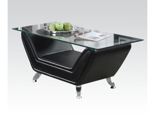 Emphasize the uniqueness of your home decor with this beautiful and stylish coffee table. This table is made in a modern style. Table has clear glass top and base of unusual shape. It is upholstered in black bonded leather. Legs of these table are creative slightly curved shape. Room with a table will be more stylish and modern. Features