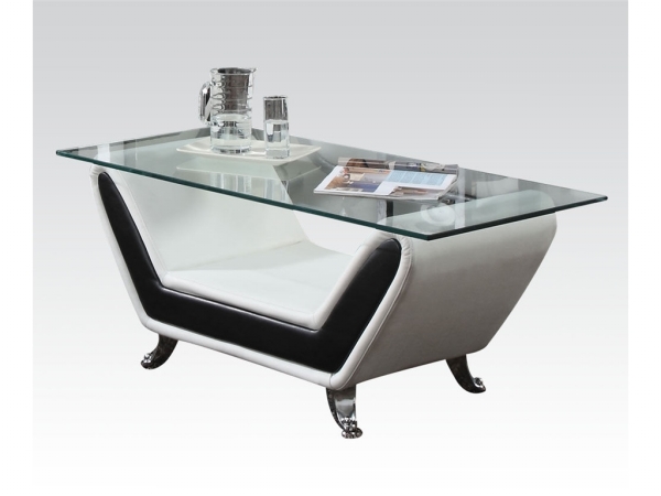 Elegant beautiful and stylish coffee table. This table is made in a modern style. Table has clear glass top and base of unusual shape. It is upholstered in white bonded leather with black insert. Legs of these table are creative slightly curved shape. This table will refresh your room and make it more interesting. Features