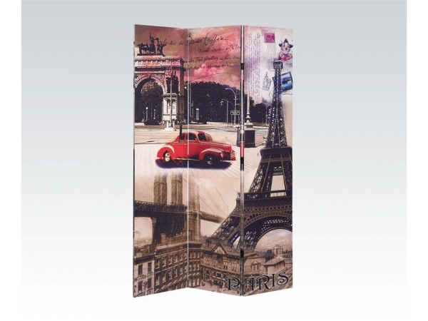 Bonjour Paris! Add chic Parisian style to any space with this floor screen from the Trudy collection. Three panels are covered in canvas illustrating scenes from around the famous French city including the Eiffel Tower and the Arc de Triomphe! Stylishly divides up any space or simply adds graphic visual interest to any room. Features