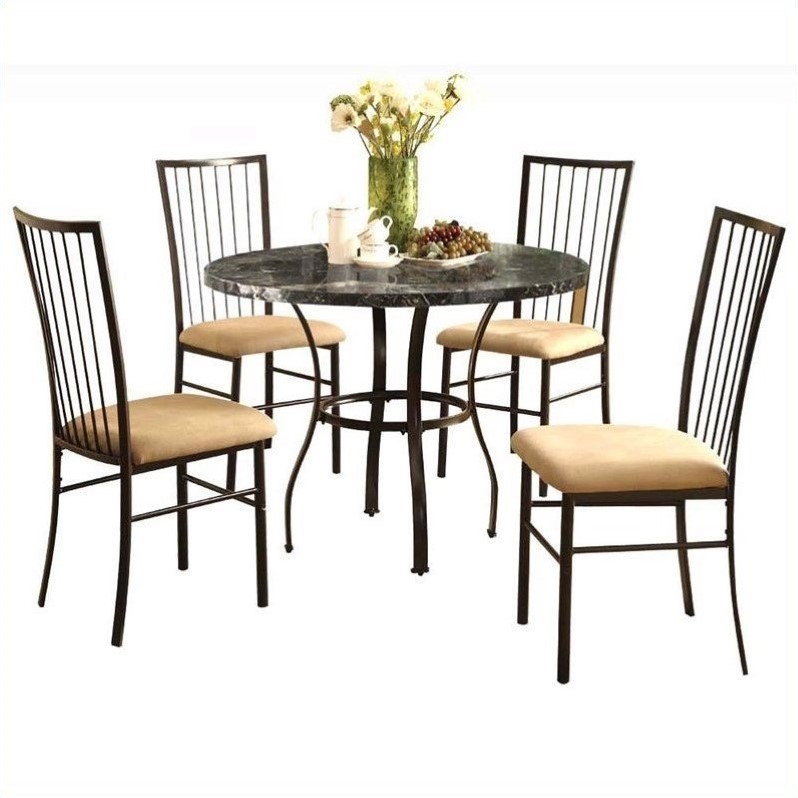 | ACME Furniture - Dining Sets - 70495W - A fanciful dining set that greatly shines with its faux marble table top. The metal framing and legs are enhanced further by the graceful accent designs. Includes 4 chairs.Black FinishIncludes 1 table and 4 chairsMade of faux marble, metal, KD and microfiberFaux marble top and metal baseMicrofiber seat cushionSpecifications:Table Dimensions: 30 H x 36 DiaChair Dimensions: 38 H x 17 W x 22 DOverall Product Weight: 86 lbs