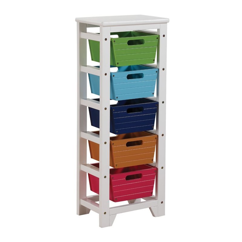 | ACME Furniture - Rack Shelving - 92154 - The Darvin Storage Rack is perfect for small spaces. Features sweet colorful baskets to organize extra storage space while adding smart functionality. Perfect for books, games, crafts or more. KD Construction (Assembly Required) Finish: Green, Blue, Dark Blue, Brown & RedMaterial: Pine WoodWith 5 BasketsMulti-ColorSpacious OrganizerSpecifications:Overall Product Dimensions: 40H x 15W x 11DProduct Weight: 23 lbs