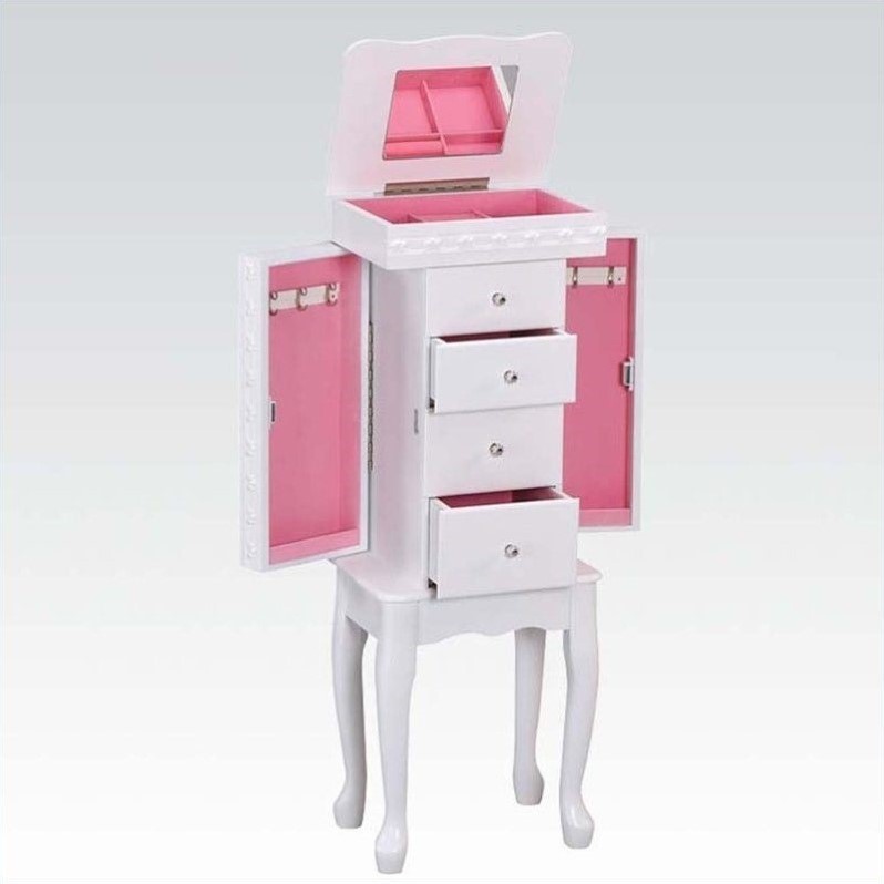 | ACME Furniture - Jewelry Armoires - 97004 - A tall and specially produced jewelry cabinet to store and organize one's valuables with greater ease. Designed with elegant patterns to provide a suitable antique appearance. Composed of solid wood veneer with pink lning coating the drawers' insides.White FinishIncludes side doors and 4 drawersMade of MDF with veneer and solid woodPink liningOpen lid with mirrorQueen anne legsSpecifications:Overall Dimensions: 35 H x 13 W x 9 DOverall Product Weight: 24 lbs