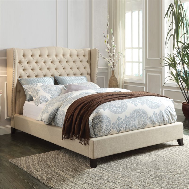 | ACME Furniture - Beds - 20644CK - The Faye collection combines traditional elements with modern design. features button tufted headboard with beige linen fabric. It's wingback headboard design and espresso tapered leg creates a luxurious atmosphere to fit any decorations. Matching Bench Sold separately. Finish: Beige & EspressoMaterial: Linen, CA Foam (TB117)Upholstered BedButton Tuftednail-head TrimWingback HeadboardSpecifications:Overall Product Dimensions: 60H x 100W x 81DProduct Weight: 143 lbs