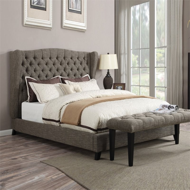 | ACME Furniture - Beds - 20897EK - The Faye collection combines traditional elements with modern design. Features button tufted headboard in 2tone chocolate linen fabric. It's wingback headboard design and espresso tapered leg creates a luxurious atmosphere to fit any decorations. Matching Bench Sold separately. Finish: 2-Tone ChocolateMaterial: Linen, CA Foam (TB117)Upholstered BedButton Tuftednail-head TrimWingback HeadboardSpecifications:Overall Product Dimensions: 60H x 96W x 85DProduct Weight: 145 lbs