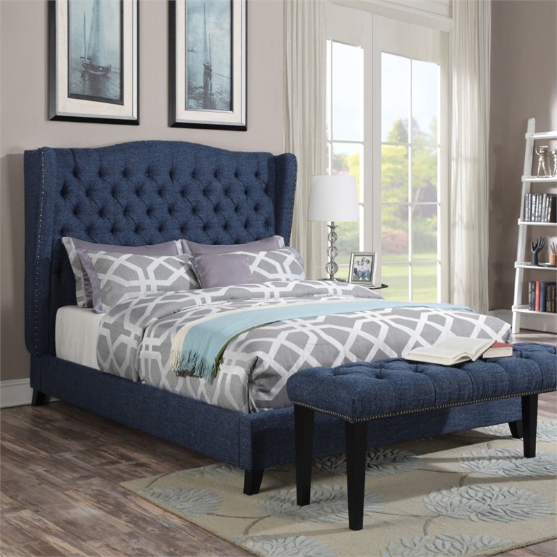 | ACME Furniture - Beds - 20877EK - The Faye collection combines traditional elements with modern design. Features button tufted headboard in blue linen fabric. It's wingback headboard design and espresso tapered leg creates a luxurious atmosphere to fit any decorations. Matching Bench Sold separately. Finish: BlueMaterial: Linen, CA Foam (TB117)Upholstered BedButton Tuftednail-head TrimWingback HeadboardSpecifications:Overall Product Dimensions: 60H x 96W x 85DProduct Weight: 145 lbs