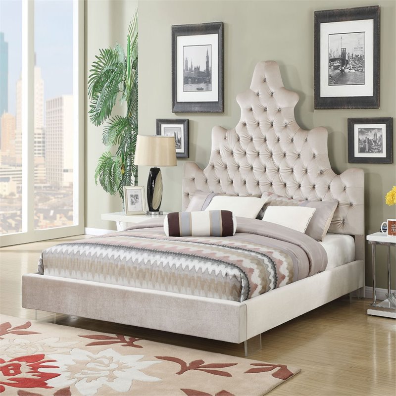 | ACME Furniture - Beds - 25027EK - The collection honesty yourself in luxury dream with the platform bed. Glass buttons gives tufting and a headboard contemporary wing , this design gives room tranquility the exquisite gem and classic charm . Plastic legs , add a touch of dramatic contrast in the room. Finish: Sand PlushMaterial: Fabric, Particle BoardBox Spring ReqiredPadded BedButton Tufted HeadboardSpecifications:Overall Product Dimensions: 77H x 90W x 82DProduct Weight: 109 lbs