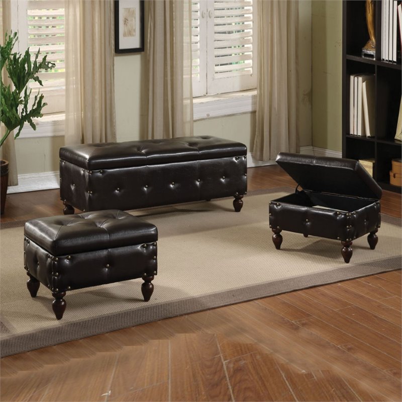 | ACME Furniture - Living Room Benches - 96023 - The Ibrahim 3Pc Pack Storage Bench & Ottomans enhances the appearance of your living room with Padded Dark Brown PU Material. This lovely set features Button Tufted Decor and Turned Espresso Legs. Both Bench & Ottomans include hidden storage and safety metal hinges. Finish: Brown & EspressoMaterial: PU,Bench StorageOttoman w/StorageOttoman w/Safety HingeSpecifications:Overall Product Dimensions: 20H x 48W x 20DProduct Weight: 96 lbs