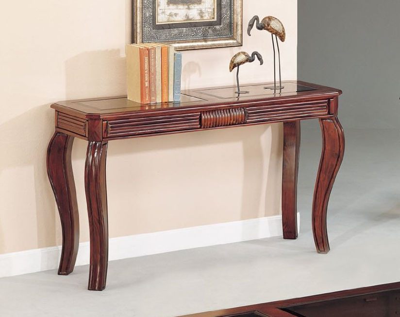 | Featuring cherry finish this Overture Cherry Sofa Table with Square Center Glass Top brings modern appeal in your living room. This gorgeous piece features two square center piece glasses on the top and is enhanced by unique molding wood design and shaped legs. Price: 156.10 ![]() |
