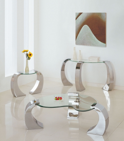 | The Metro Chrome Coffee Table with Glass Table Top will create a sleek and modern look in your living area. Smooth shaped beveled edge table top rests above three arched legs with bold curves in a shiny chrome finish for the perfect finishing touch. Price: 454.31 ![]() |