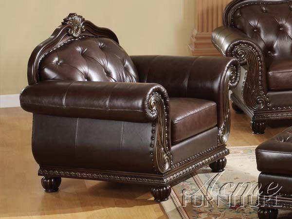 Style: Traditional. Finish: Cherry. Select hardwood solids and veneers. Durable construction. Intricate wood carvings. Top grain leather upholstery. Button tufted design. Decorative nail head trim. Boxed seat cushions. Wide roll arm. Some assembly may be required. Dimensions: 47 x 37 x 42 H.