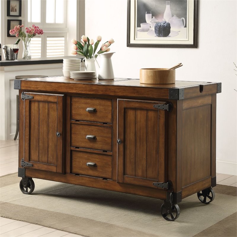 | ACME Furniture - Kitchen Carts - 98186 - The Kabili kitchen cart with durable construction of wood and metal in a unique distress tobacco finish will become a stylish and function centerpiece of your home. The kitchen cart rests on casters, allowing you to move it easily. The storage space includes drawers and cabinets. This kitchen cart will make a beautiful addition to your home. Finish: Antique TobaccoMaterial: Poplar Wood, MDF, Qiu Wood Veneer, Metal CastersTop w/2 Removable Boards3 Drawers: Glide Bottom MetalCaster Wheels IncludedSpecifications:Overall Product Dimensions: 36H x 57W x 22DProduct Weight: 172 lbs