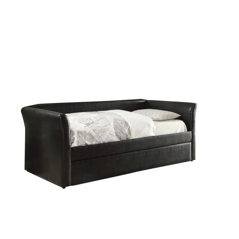 | ACME Furniture - Daybeds - 39145 - Add an extra space for your overnight guests with the Misthill Daybed and Trundle set. The daybed offers a modern design that includes a black faux leather with clean lines, and is a welcoming bed for one with the option to pull out the trundle for an additional sleep space if needed. Casters make use of the trundle easier for to access the extra sleep space. Finish: BlackMaterial: PU, Wood FramePadded Daybed and Trundle(15+15) Slat System IncludedTrundle IncludedMattress sold separatelySpecifications:Overall Product Dimensions: 37H x 90W x 43DProduct Weight: 148 lbs